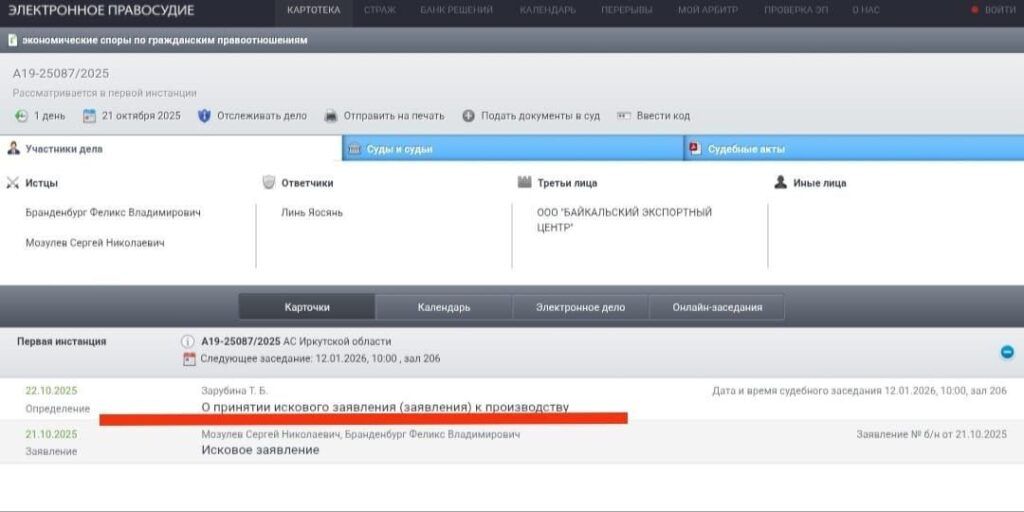 ВНИМАНИЕ!!! АРБИТРАЖНЫЙ СУД ИРКУТСКОЙ ОБЛАСТИ МОЖЕТ ИСКЛЮЧИТЬ ДОЛЖНИКА ЛИНЬ ЯОСЯНЬ ИЗ СОСТАВА БАЙКАЛЬСКОГО ЭКСПОРТНОГО ЦЕНТРА